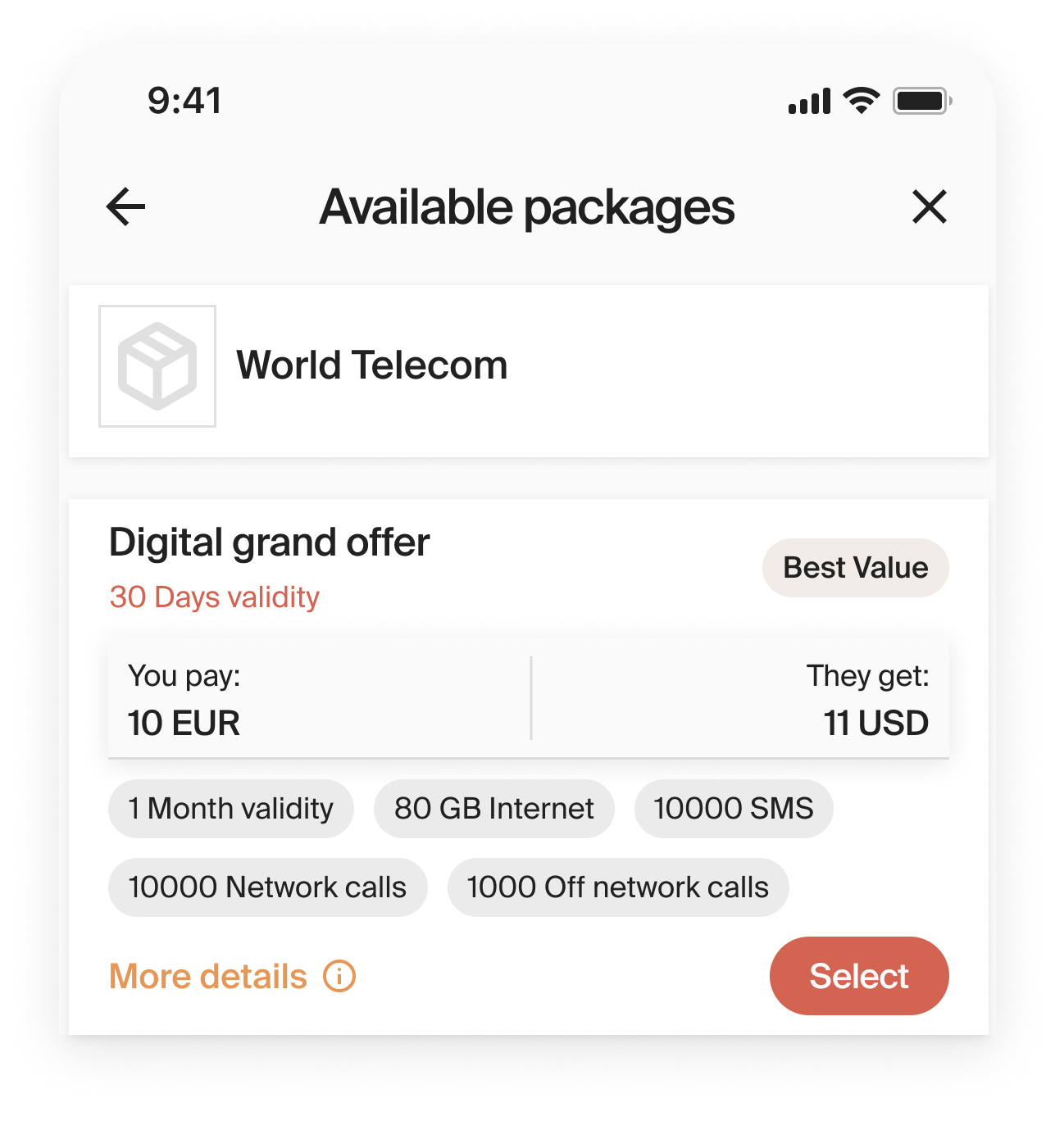 طريقة موثوقة وسهلة للبقاء على اتصال مع أحبائك. سواء كنت تسميه Airtime للهاتف المحمول أو رصيد الهاتف المحمول أو إعادة شحن الهاتف المحمول، فأنت في المكان الصحيح. أرسل Airtime فورًا إلى أي رقم هاتف محمول في جميع أنحاء العالم. باستخدام تطبيقنا على الهاتف المحمول، يمكنك إرسال Airtime رقميًا من خلال الاختيار من بين مجموعة متنوعة من الباقات التي يقدمها مزود خدمة المستلم.